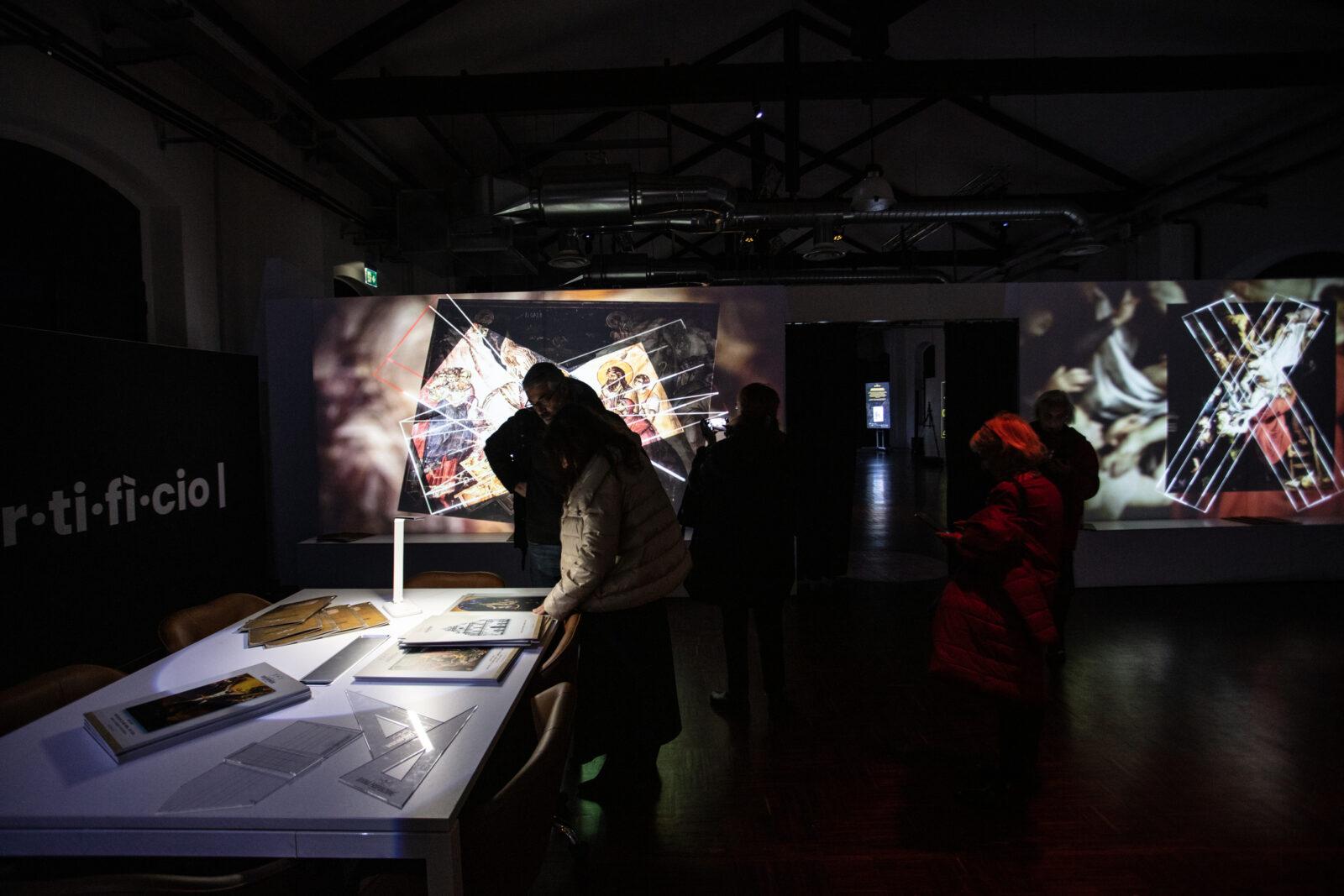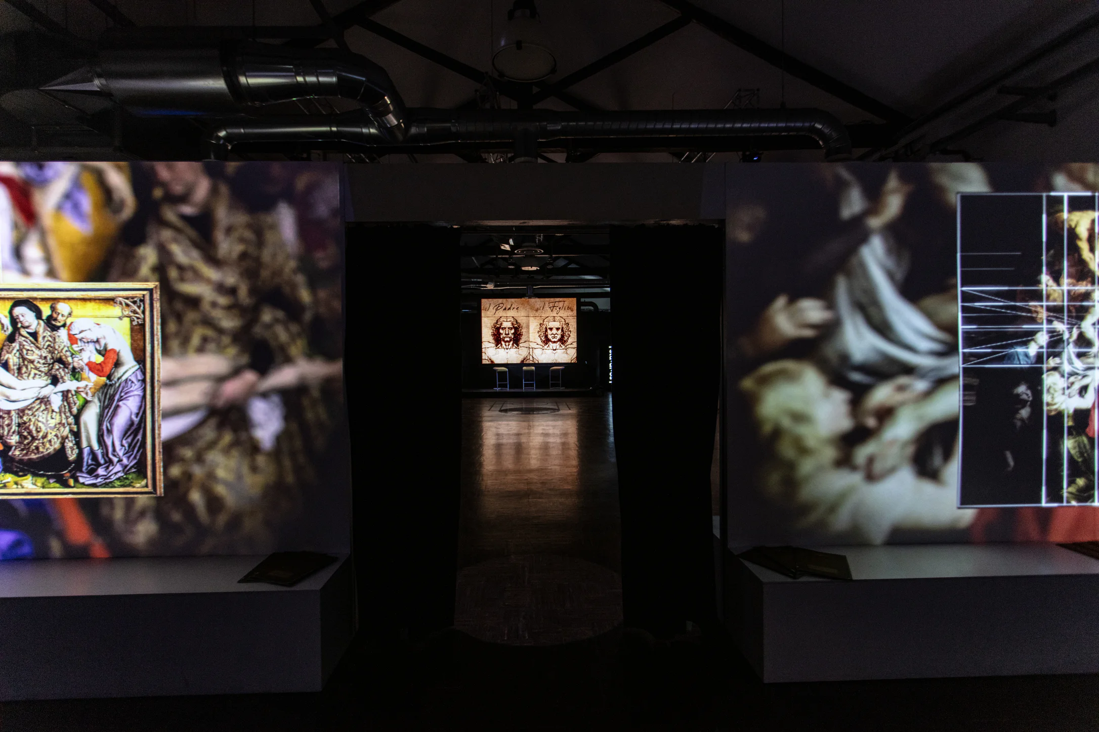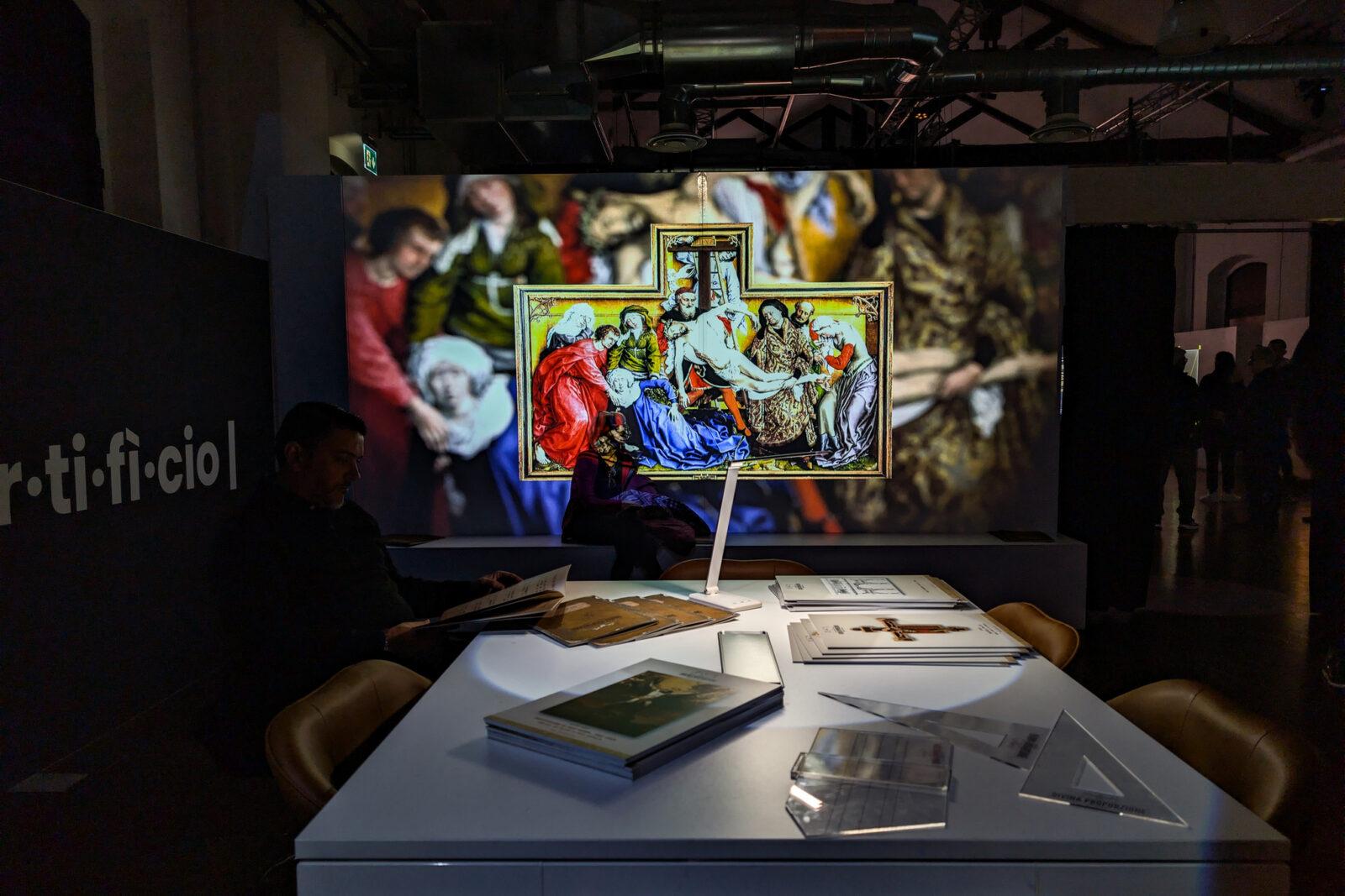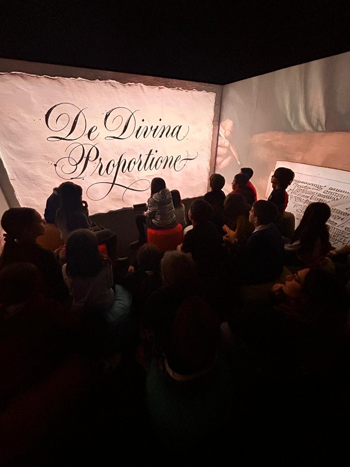 Ogni ambiente rivela un livello di lettura: dalla stanza introduttiva che scompone la Divina Proporzione, ai grandi Ledwall che mostrano la doppia figura dell’Uomo Vitruviano, fino alle proiezioni sui retabli, dove le croci invisibili emergono come griglie luminose.