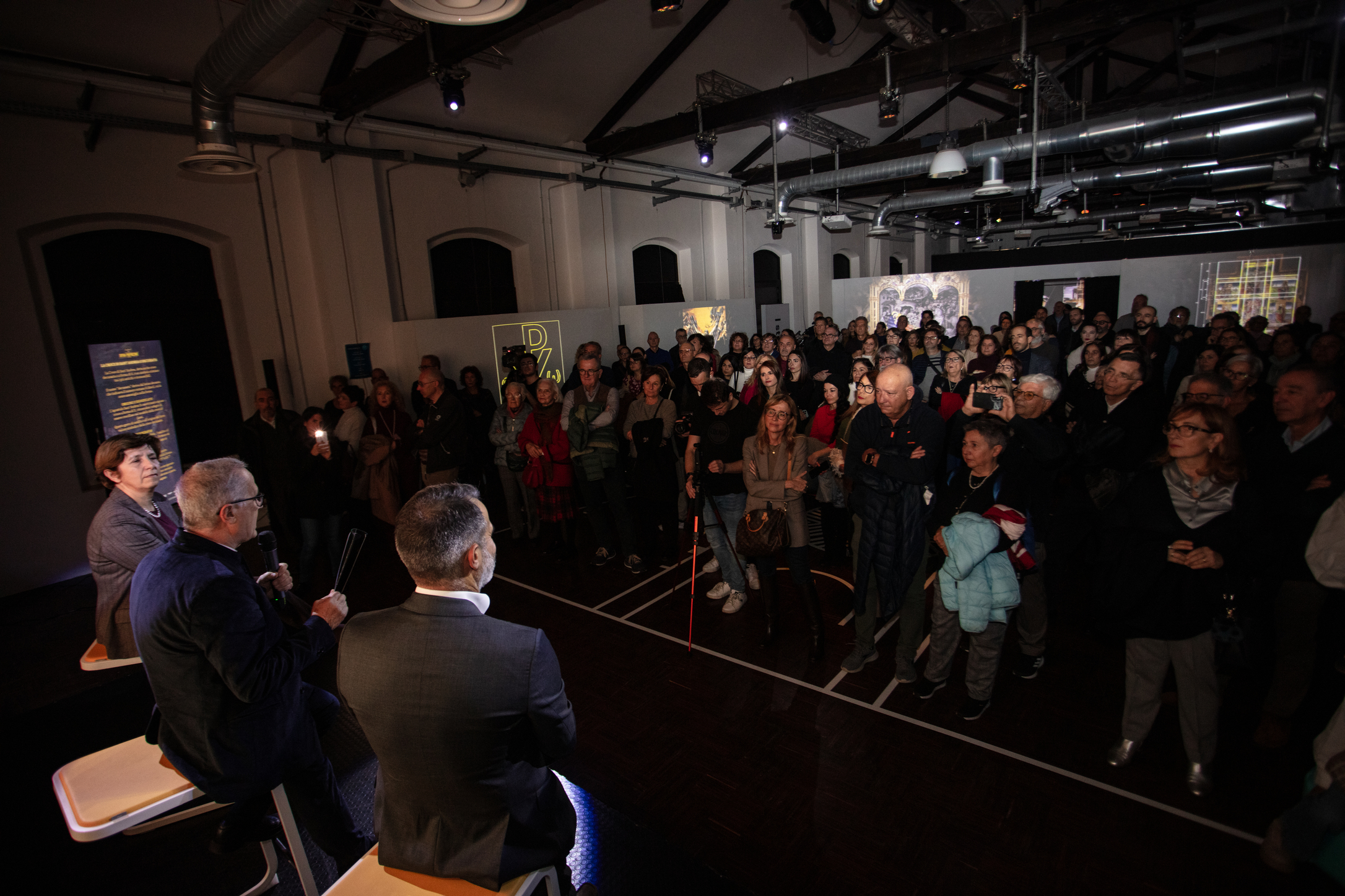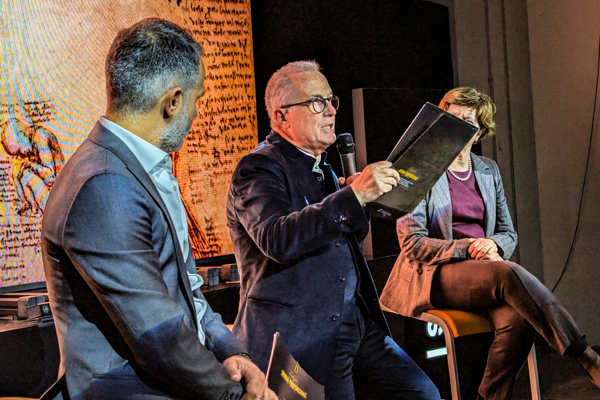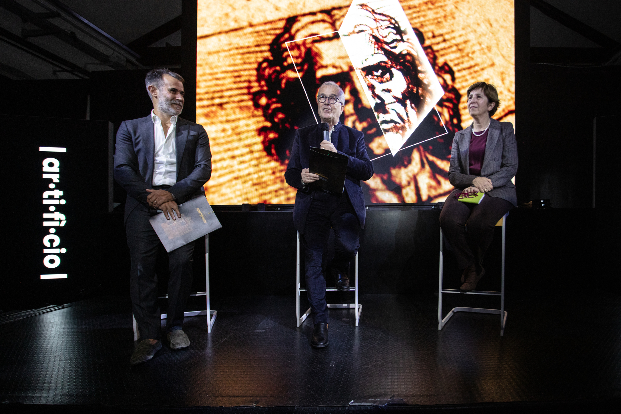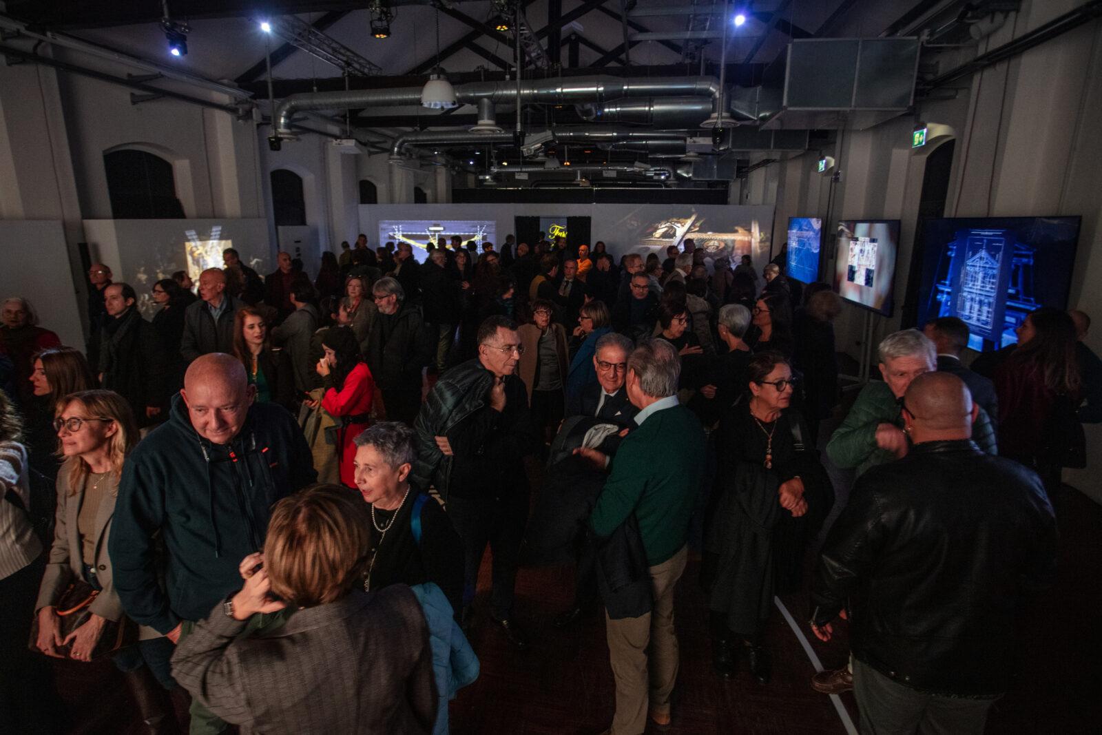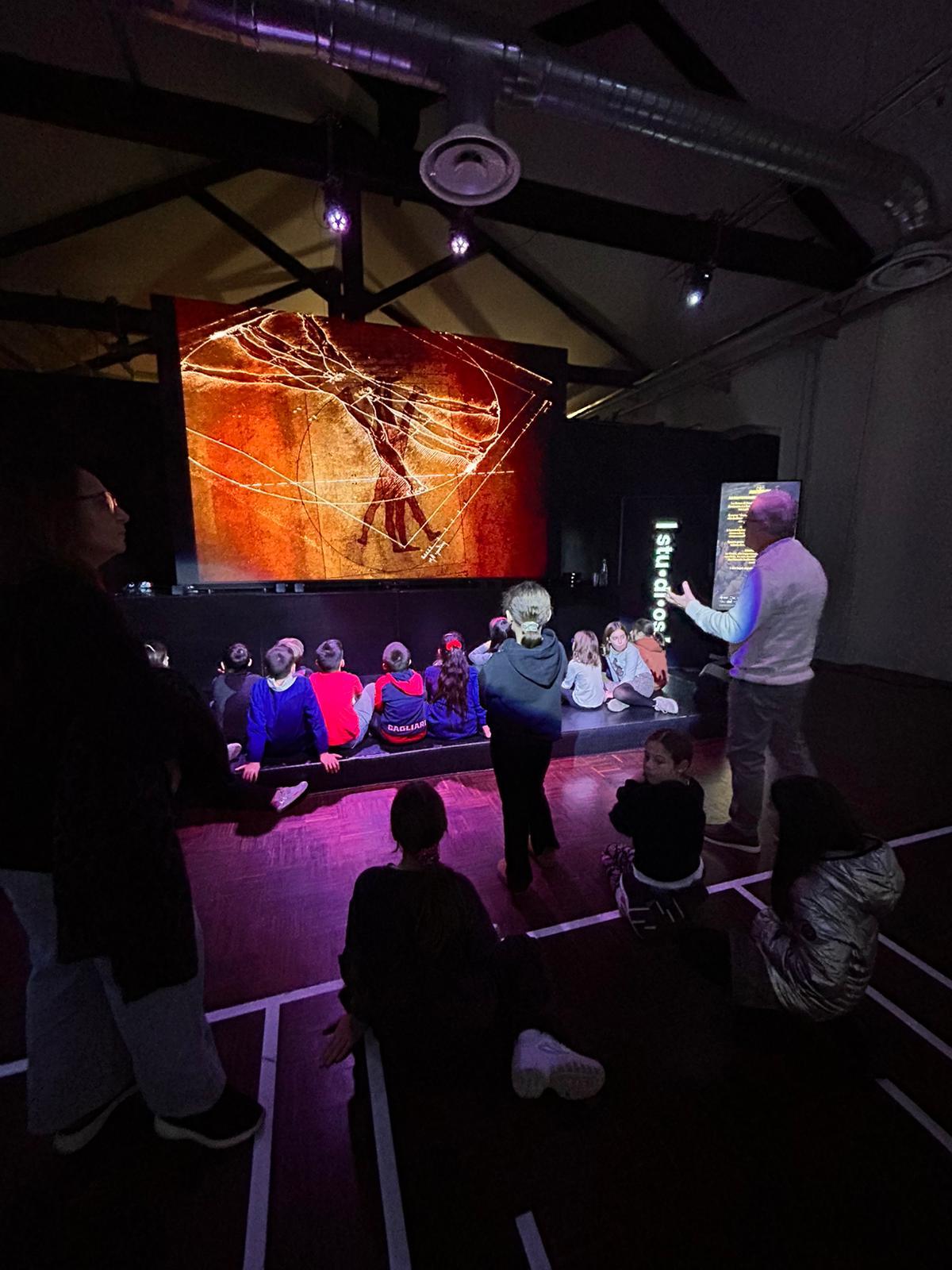 Ogni ambiente rivela un livello di lettura: dalla stanza introduttiva che scompone la Divina Proporzione, ai grandi Ledwall che mostrano la doppia figura dell’Uomo Vitruviano, fino alle proiezioni sui retabli, dove le croci invisibili emergono come griglie luminose.